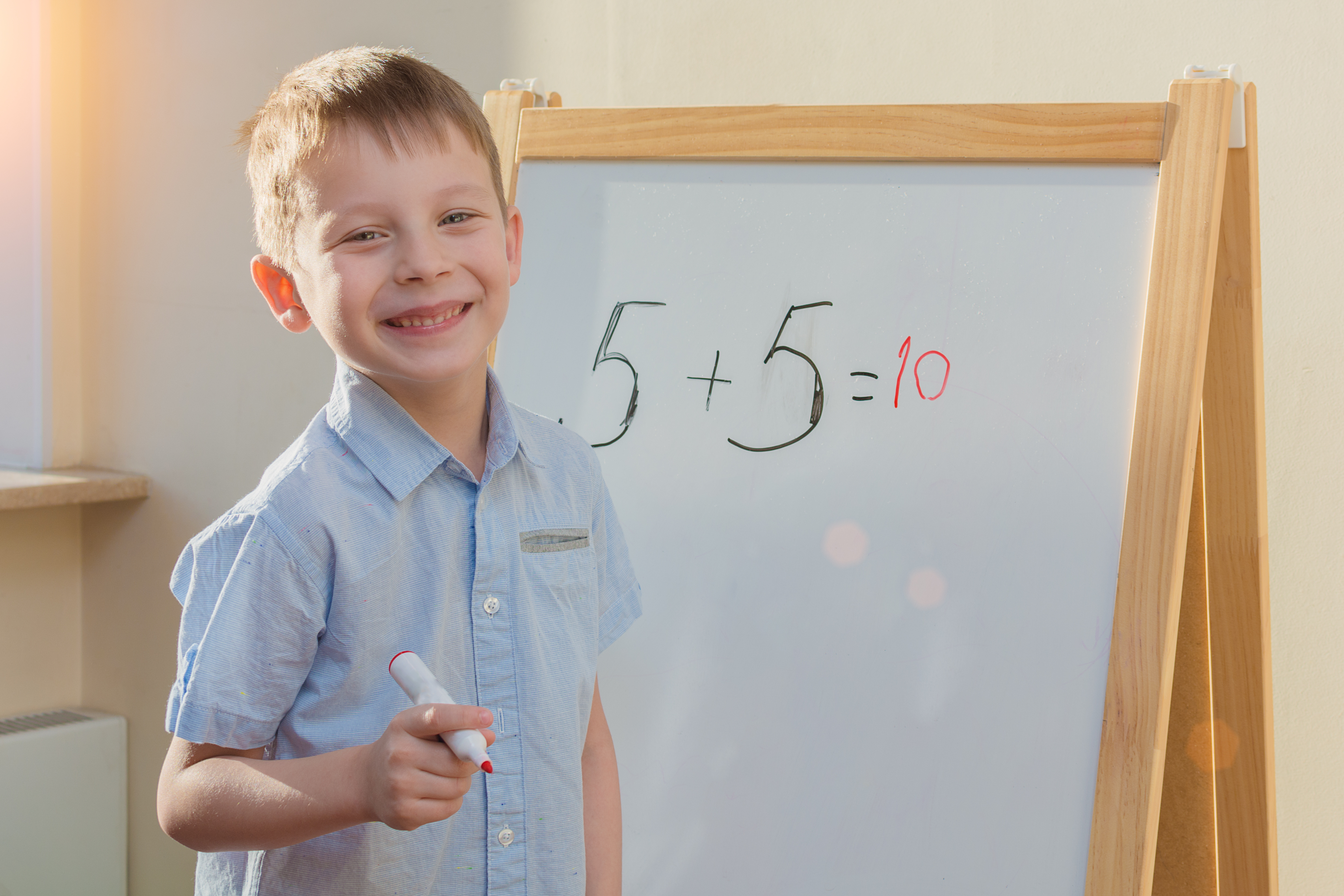 happy, smiling preschooler stands with a red marker in his hands at a white school board with a correctly solved math example. The idea is to teach children basic school knowledge at home.